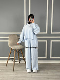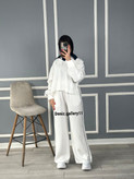 بلوز آزاد با یقه سفید لایهای و جزئیات ظریف روی آستین، کنار شلوار بگ خوشفرم، یه استایل راحت اما خاص برات میسازه.